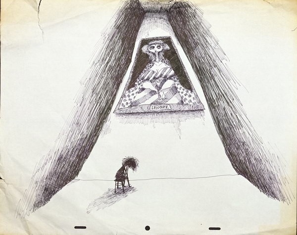 O curta de 1982, narrado por Vincent Price, conta a história de um menino obcecado pelas sombras, cujo autor preferido é, adivinhem quem? Edgar Allan Poe. Veja abaixo a imagem de uma das ilustrações de Burton que deram origem ao curta, e repare no nome escrito abaixo do quadro da mulher: