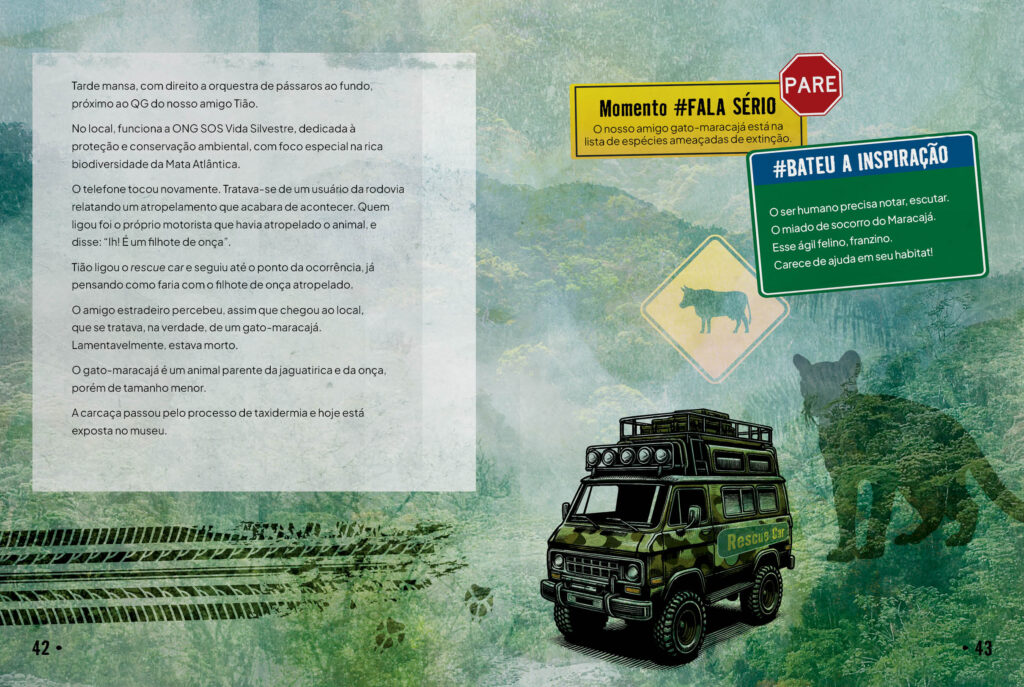 Com 76 páginas de conteúdo envolvente e projeto gráfico de altíssima qualidade, a obra combina literatura, poesia, ciência, aventura e informação, apresentando ao público infantojuvenil histórias reais inspiradas no trabalho de Sebastião “Tião da Estrada” Silvestre, biólogo da ONG SOS Vida Silvestre, cujo cotidiano de resgates é narrado com emoção, humor e profundidade.