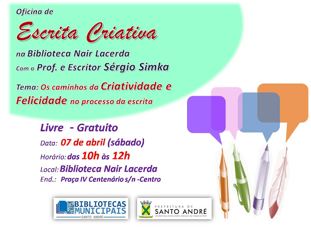 Dando sequência à Oficina de Escrita Criativa, o professor Sérgio Simka abordará os caminhos da criatividade e felicidade no processo da escrita.
