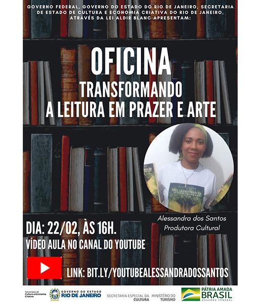 Oficina – Transformando A Leitura Em Prazer e Arte: é uma oficina online, contemplada no edital Cultura Presente RJ, patrocinada pelo Governo Federal, Governo do Estado do Rio de Janeiro, Secretaria de Estado de Cultura e Economia Criativa do Rio de Janeiro, através da Lei Aldir Blanc. A proposta da oficina é estimular o interesse do público no hábito de leitura, com dicas e técnicas que possam contribuir para aproximá-los deste tipo de prática tão importante para o crescimento pessoal e profissional. Exercitar e melhorar a capacidade de interpretação textual, além de ser uma ferramenta criativa e recreativa, trabalhando a imaginação e senso crítico de quem lê. Na oficina, a produtora e escritora Alessandra dos Santos, compartilhará também um passo a passo para quem deseja ingressar na carreira de escritor, baseado em seu contato e vivência no processo de escrita e publicação de livro.