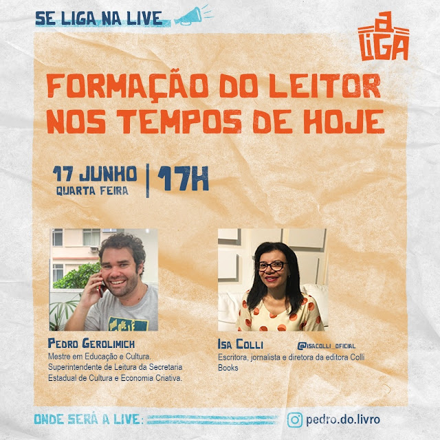 Nesta quarta-feira, 17/06, a partir das 17h, o Superintendente de Leitura da Secretaria do Rio, Pedro Gerolimich promove uma live com a escritora, jornalista e diretora da Colli Books, Isa Colli. Durante o bate papo, a dupla comentará sobre o tema ‘Formação do Leitor nos tempos de Hoje!’. A live acontece no instagram @pedrodolivro
