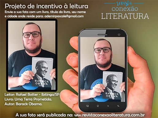 O nosso projeto de incentivo à leitura consiste em indicar livros e incentivar autores e leitores. A publicação das fotos dos leitores com os livros poderão ser feitas no site da revista: www.revistaconexaoliteratura.com.br , nas redes sociais Instagram ou Facebook e até nas edições mensais da revista digital Conexão Literatura.