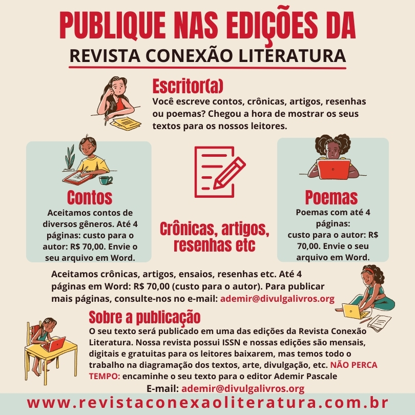 Autor(a), publique nas edições da Revista Conexão Literatura, seja conto, poema, crônica, resenha, artigo, etc. Leia as informações para submissão em nossa revista literária.