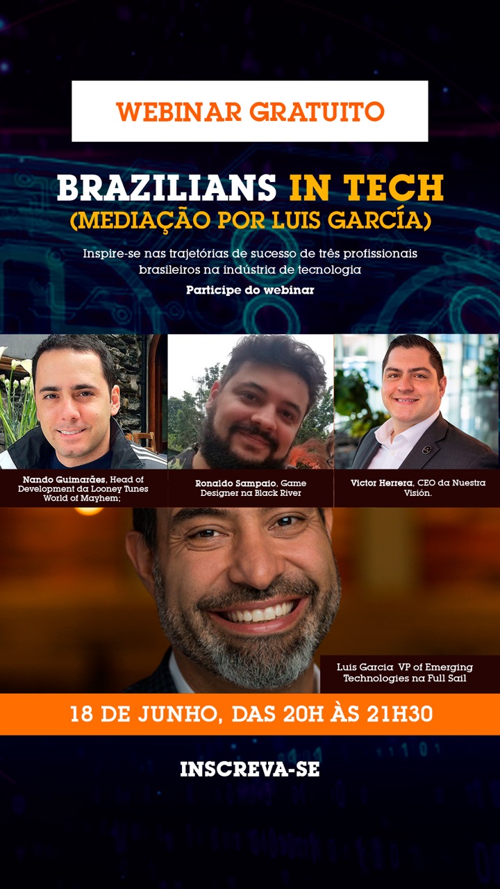 Brasil, 16 de junho de 2020: O Brazilians In Tech é um painel que está sendo desenvolvido pela Full Sail University, instituição reconhecida como uma das mais importantes universidades na indústria do entretenimento, e que tem como mediador do encontro Luís E. García, VP of Emerging Technologies.